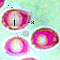 Ellipsoidal, 6-8 by 4-5µm; ornamented with tiny spines.