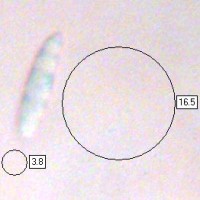 Fusiform, smooth, 13-17 x 4-5µm; containing several oil drops when fully mature.